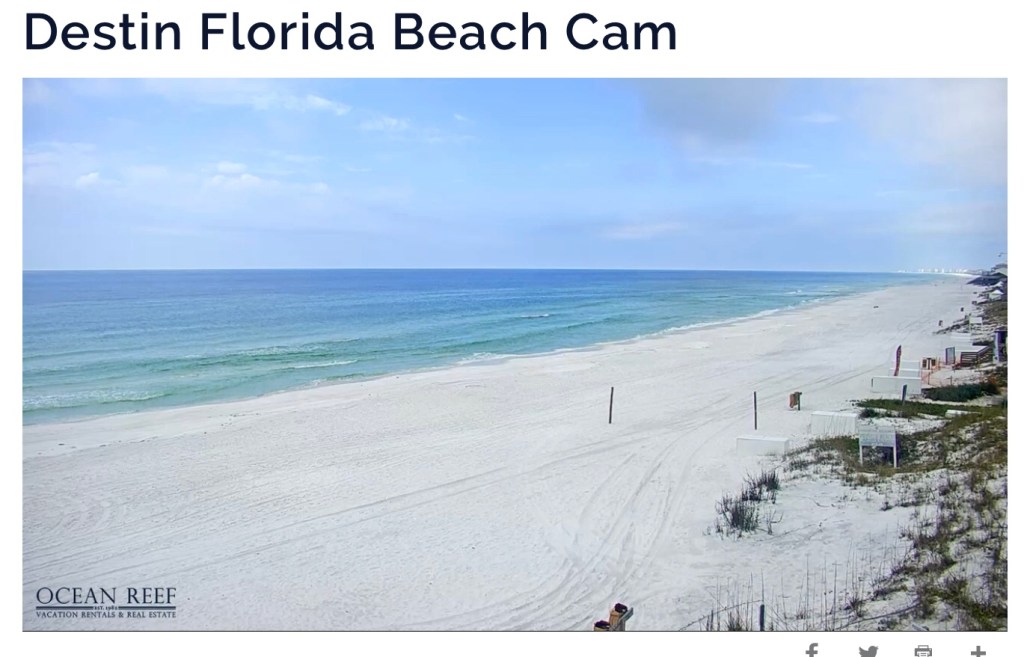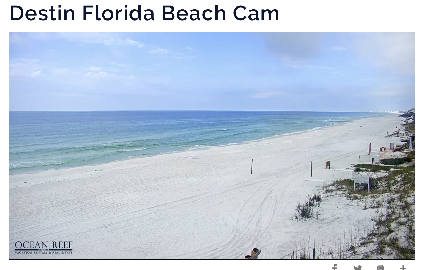 Sunday Noon Webcam Snapshot Of Empty Destin, Florida Beach … Empty Beach Richard LawMarch 22, 2020General Reading Post navigation PreviousNext Share this: Email a link to a friend (Opens in new window) Email Print (Opens in new window) Print Share on X (Opens in new window) X Share on Facebook (Opens in new window) Facebook Share on Pinterest (Opens in new window) Pinterest Like Loading... Related