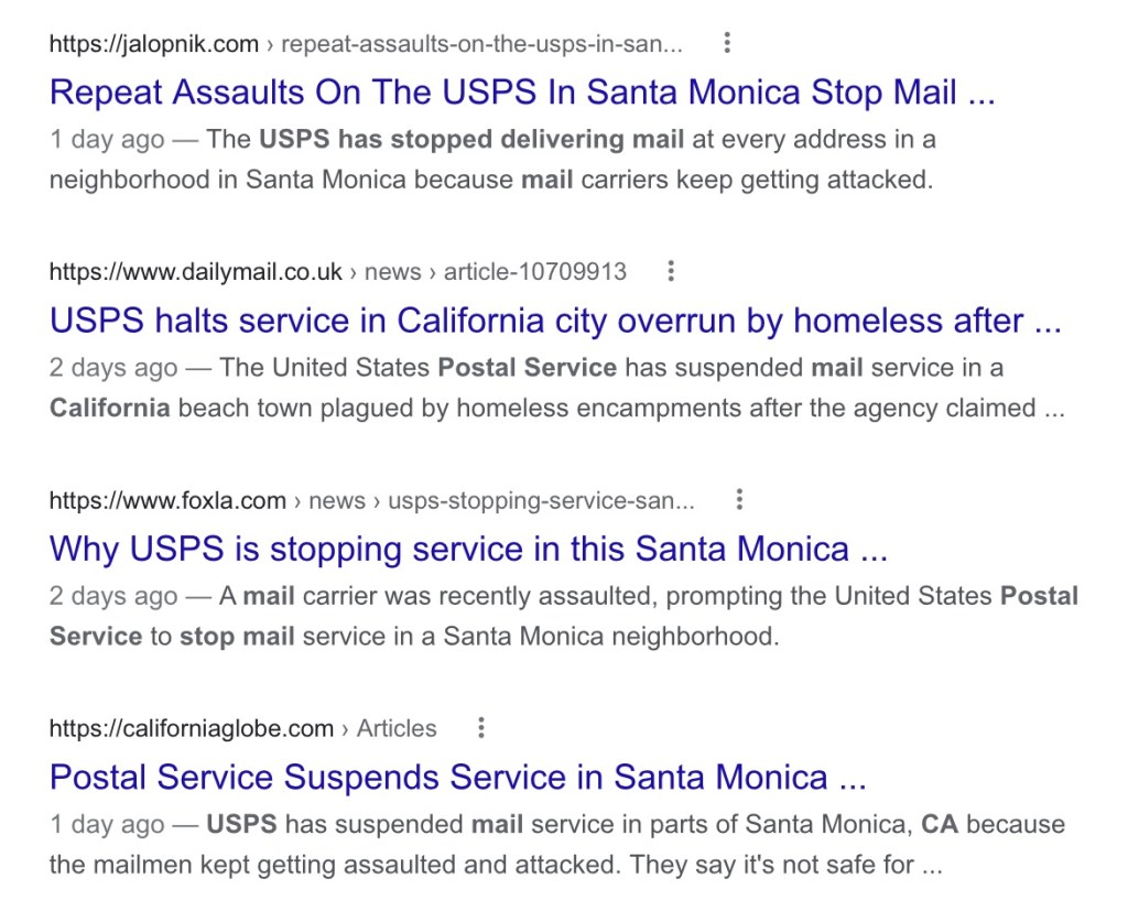 USPS Has Stopped Mail Service In Santa Monica +++ Attacks On Mail Carriers +++ Google The News +++ Stay Safe +++ Maybe Avoid The Area Richard LawApril 13, 2022April 13, 2022General Reading Post navigation PreviousNext Share this: Click to email a link to a friend (Opens in new window) Email Click to print (Opens in new window) Print Click to share on X (Opens in new window) X Click to share on Facebook (Opens in new window) Facebook Click to share on Pinterest (Opens in new window) Pinterest Like Loading... Related